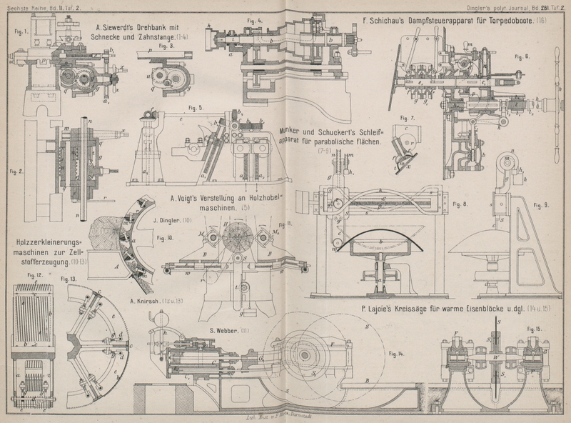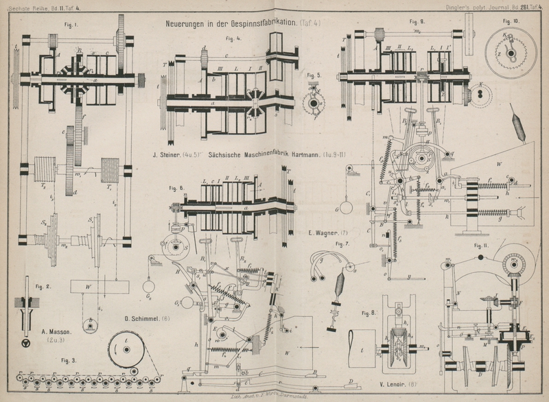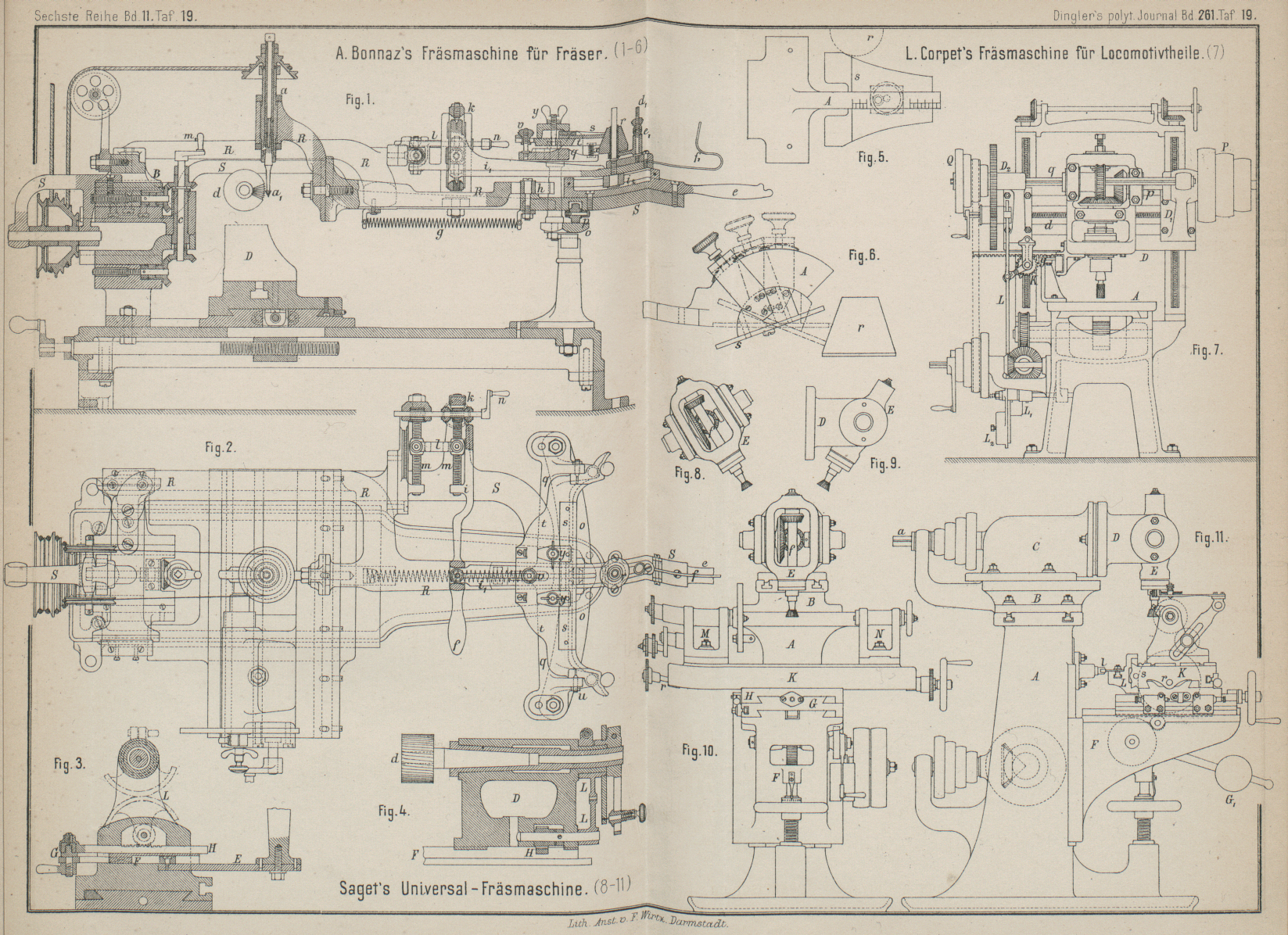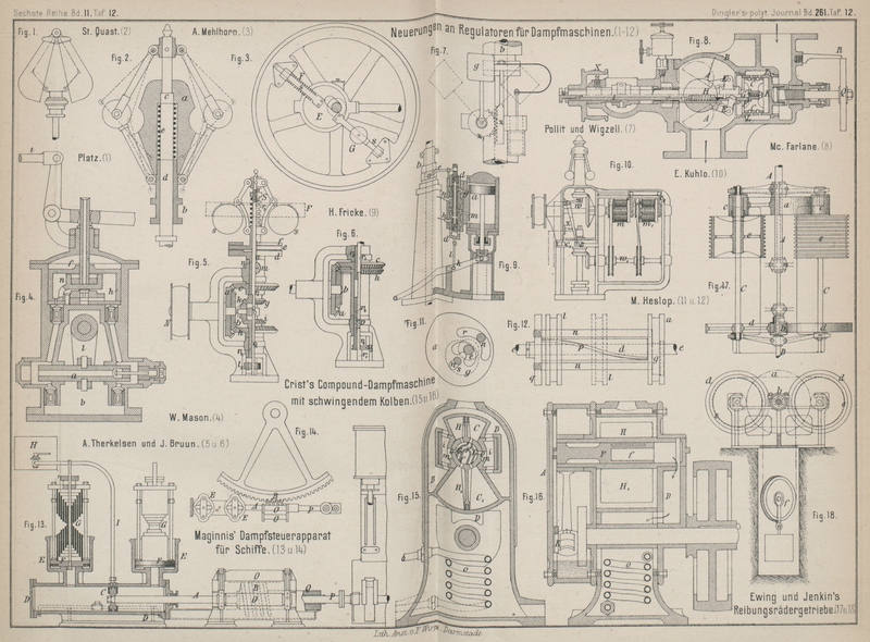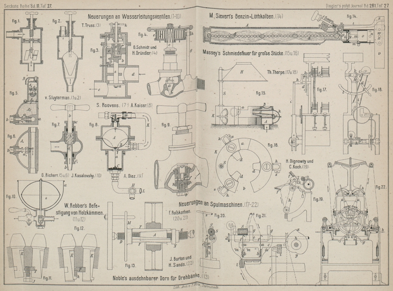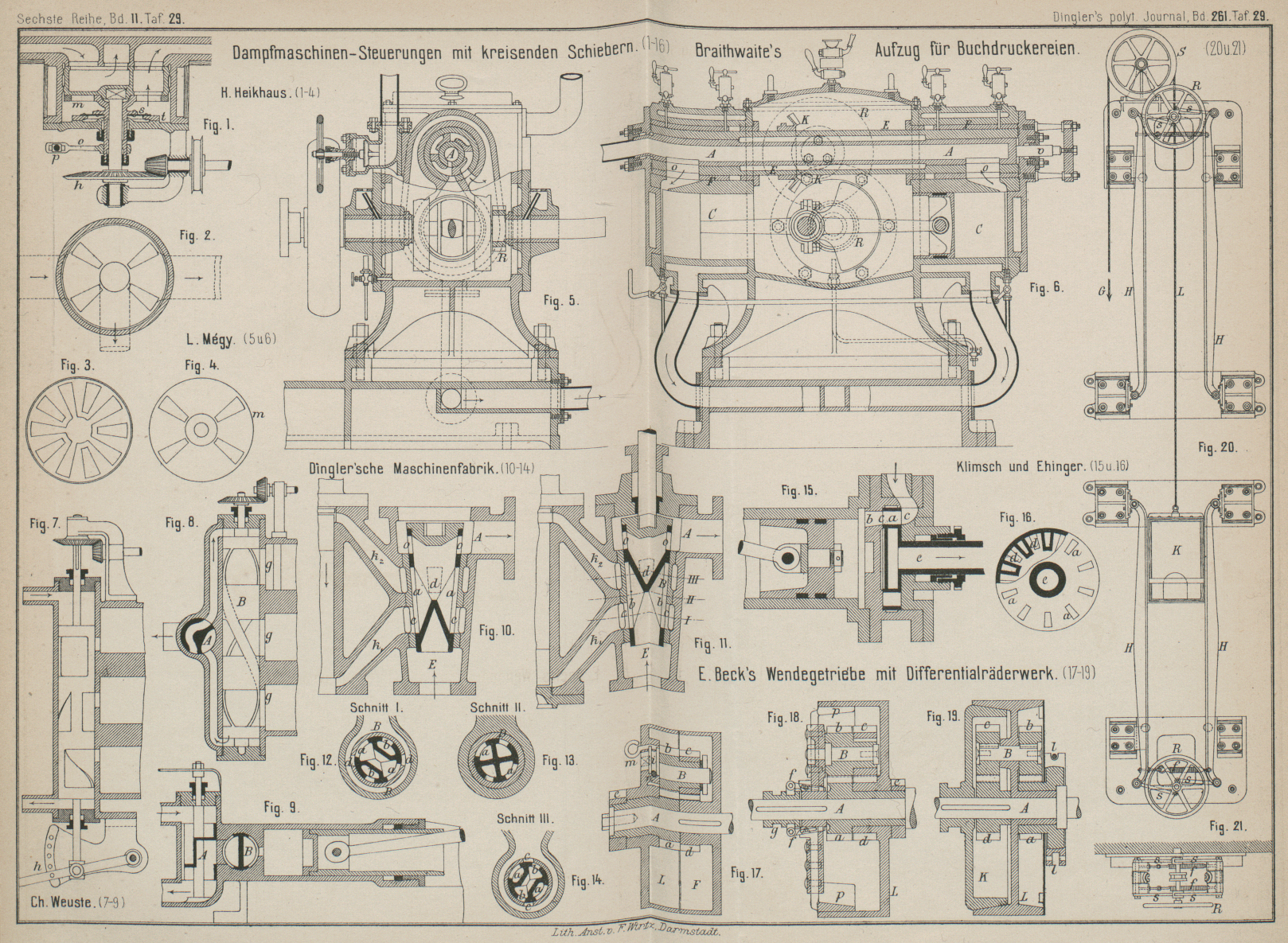 Berichtigungen. In der Beschreibung der Wasserwerke in Buffalo bezieh. Gashill's Zwillings-Compound-Dampfpumpe ist S. 319 Z. 1 v. u. zu lesen: „33mm,4“ und „44mm,4“ statt „350mm“ und „470mm“. – In der Beschreibung des Regulators von Therkelsen und Bruun S. 188 ist die richtige Wirkungsweise angezweifelt, da die Räder a und c gleich groſs angenommen sind. Diese Voraussetzung ist irrig, ebenso die daraus gezogene Folgerung. AtlaszuDingler's polytechnischem Journal. Band 261. (Siebenundsechzigster Jahrgang.) Jahrgang 1886. Enthaltend 33 lithographirte Tafeln. Stuttgart.Verlag der J. G. COTTA'schen Buchhandlung. Tab. I. Tab. II. Tab. III. Tab. IV. Tab. V. Tab. VI. Tab. VII. Tab. VIII. Tab. IX. Tab. X. Tab. XI. Tab. XII. Tab. XIII. Tab. XIV. Tab. XV. Tab. XVI. Tab. XVII. Tab. XVIII. Tab. XIX. Tab. XX. Tab. XXI. Tab. XXII. Tab. XXIII. Tab. XXIV. Tab. XXV. Tab. XXVI. Tab. XXVII. Tab. XXVIII. Tab. XXIX. Tab. XXX. Tab. XXXI. Tab. XXXII. Tab. XXXIII.