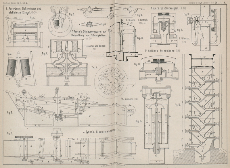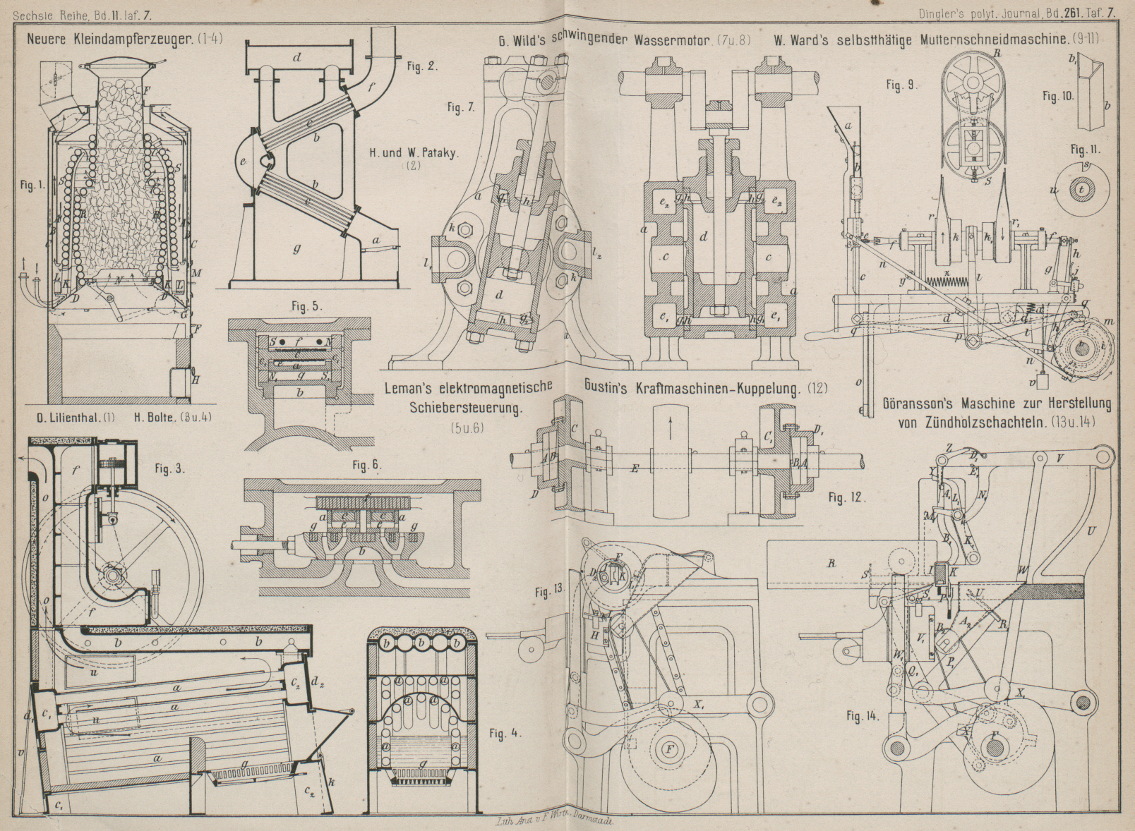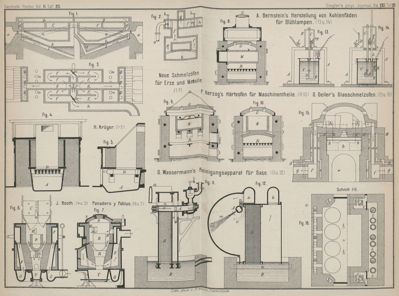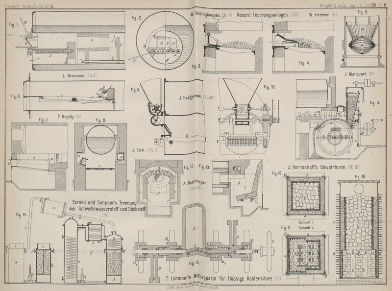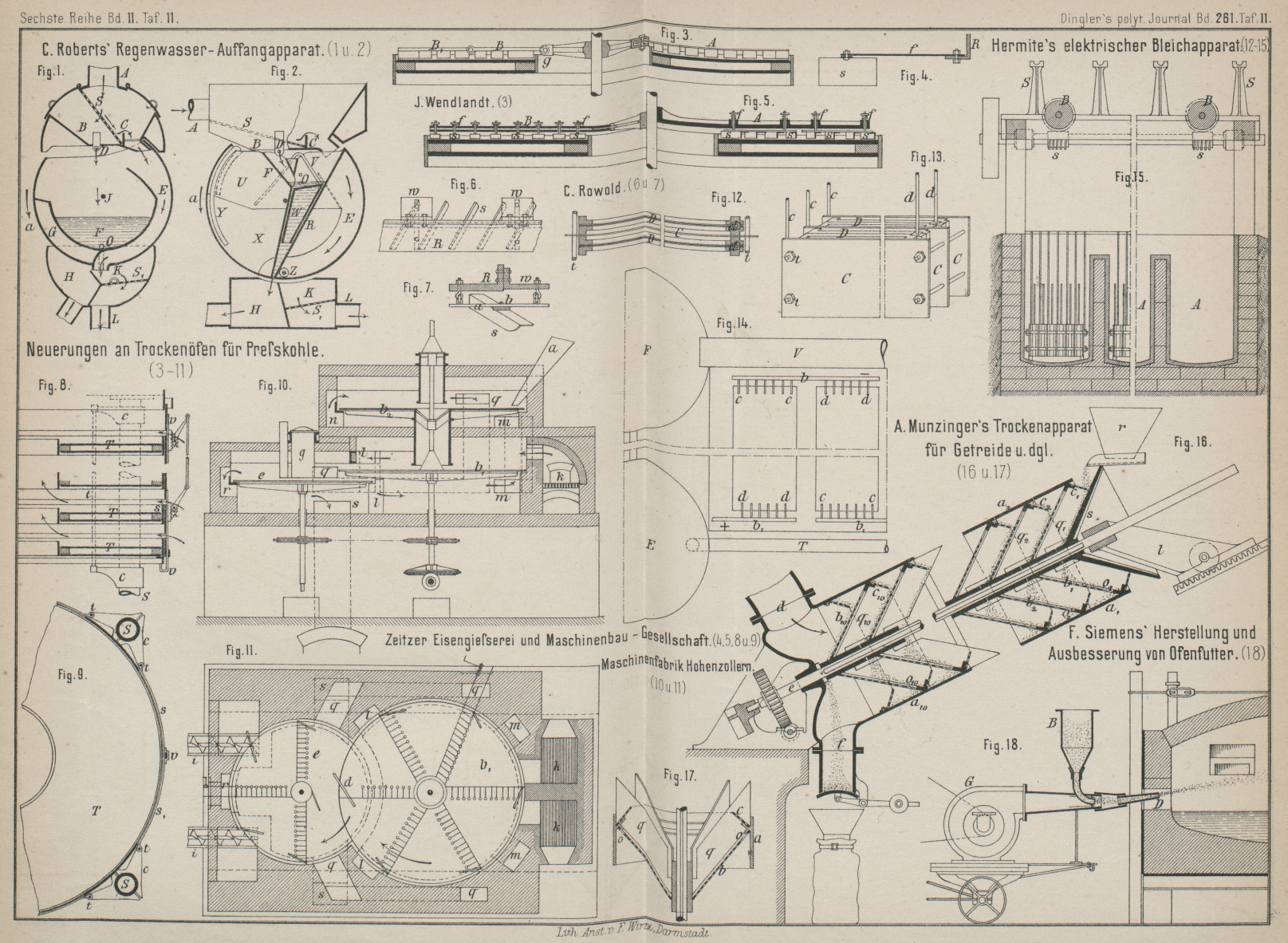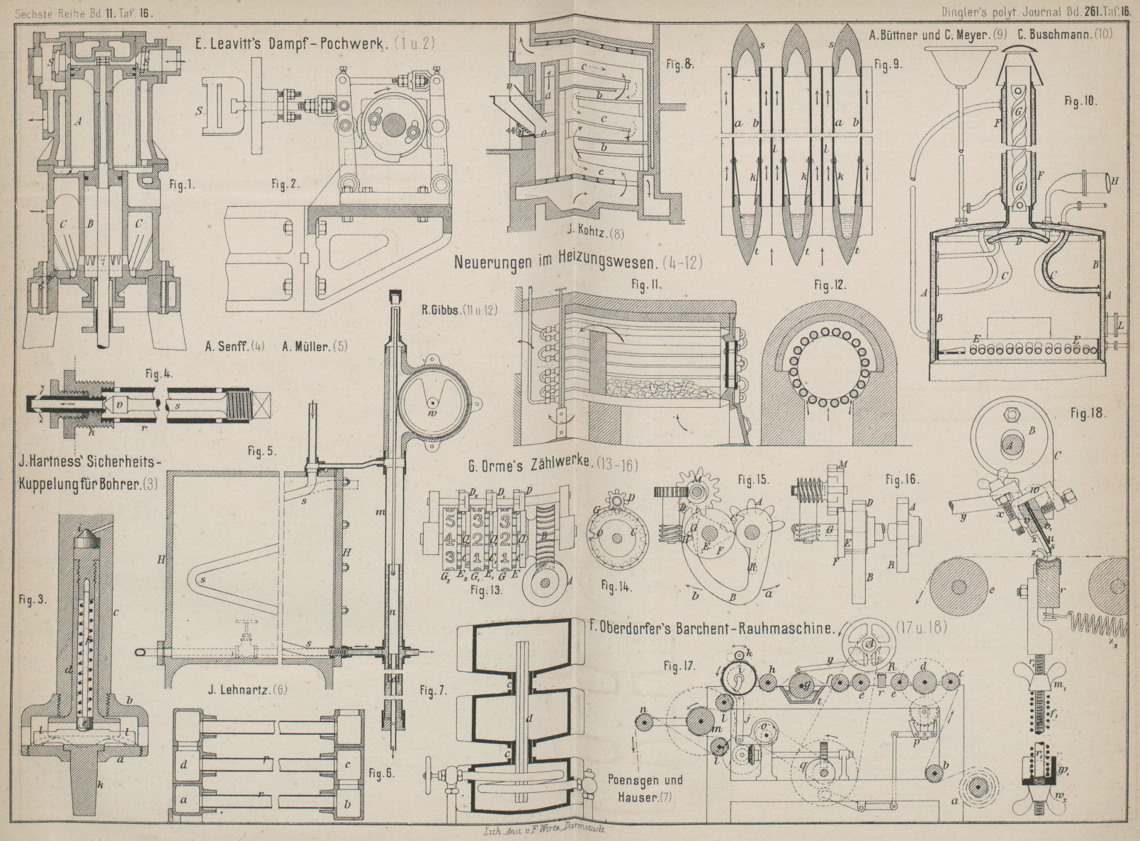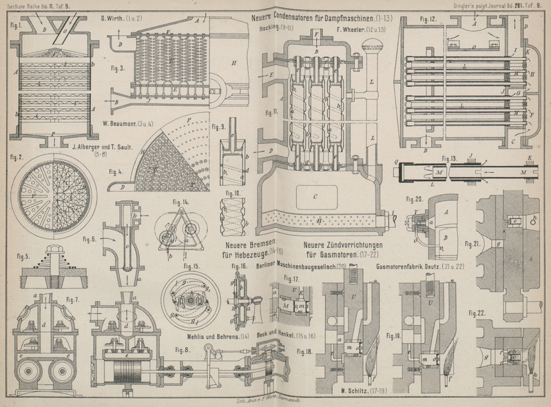 Berichtigung. In der Tabelle betreff. Auſstieg des Erdöles S. 83 Spalte 2 ist zu setzen „t“ statt „a“. – S. 88 (W. Thomson's Prüfung von Stärkekleister) Z. 13 v. u. ist zu lesen „(250mm lang und 6mm dick)“ statt „(25mm + 4mm)“. Dingler's polytechnisches Journal. Herausgegeben von Prof. Joh. Zeman und Dr. Ferd. Fischer in Stuttgart in Hannover. 67. Jahrgang: 28. Juli 1886. Band 261. Heft 4. Mit 3 Tafeln Abbildungen (Tafel 9–11) und Textabbildungen. Stuttgart. Verlag der J. G. COTTA'schen Buchhandlung.1886 Cupolofen mit getrennter Verbrennung des Kohlenoxydgases. D. R. P. 33212. Alleinigen Vertrieb für Deutschland hat FRITZ W. LUERMANN, Techn. Bureau OSNABRUECK. Bezirksvertreter gesucht. Textabbildung Bd. 261 Textabbildung Bd. 261 Anzeigen der Redaction (28. Juli 1886.)vonDingler's polytechnischem Journal. Inhalt von Nr. 4 Band 261. * bedeutet mit Abbild. Neuerungen an Condensatoren für Dampfmaschinen. Oberflächencondensatoren: F. Wheeler's Condensator mit einseitig befestigten Röhren und eingesteckten Umlaufsröhren *. W. Beaumont's Condensator mit schraubenartig in einander gewundenen Wellröhren für Torpedomaschinen *. F. und H. Hocking's Condensator mit zwischen Doppelröhren gebildeten schraubenförmigen Kanälen, besonders zur Gewinnung von Süſswasser auf Schiffen *. Einspritzcondensatoren: O. Wirth's Condensator mit radial über einander angeordneten Stäben zur Zertheilung des Wasserstrahles *. J. Alberger und Th. Sault's Verbindung von sog. Injector- und Ejectorcondensatoren mit Pumpen zur Absaugung des Luft- und Wassergemisches * 145 J. Klein's Kleindampfmaschine bez. Speisepumpe für das Condensationswasser; von Klein, Schanzlin und Becker in Frankenthal * 150 Neue Zündvorrichtungen für Gaskraftmaschinen: Zündungen mit Uebertragungsflamme für Maschinen, welche mit verdichtetem Gemenge arbeiten; von M. Schütz * bez. der Gasmotorenfabrik Deutz *. Zündung durch Berührung mit erhitzten Körpern für Maschinen, welche mit verlängertem Cylinderraume arbeiten; von der Berliner Maschinenbau Actiengesellschaft vormals L. Schwartzkopff * 151 Neuere Bremsen für Hebezeuge: Sperrkegelbremse auf einer besonderen Welle des Windewerkes; von der Maschinenfabrik Cyclop, Mehlis und Behrens in Berlin *. J. Weidtman's Sicherheitskurbel. Beck und Henkel's Geschwindigkeitsbremse für Hebezeuge * 154 Gewellte Dampfkessel-Flammrohre und deren Herstellung: S. Fox's Flammrohre mit ungewellter Schweiſsstelle bez. Presse und Walzwerk zu deren Herstellung. Ueber Festigkeit von Wellrohren gegen äuſseren Druck. H. Mc Kaig und J. C. Stitt's Wellrohre für die Feuerkammern von Schiffskesseln 156 Brown und Sharpe's Universal-Schleif- und Schärfmaschine * 157 G. Eiffel's bez. A. Cottrau's zerlegbare, aus Dreiecken bez. Vierecken zusammengesetzte eiserne Brücken * 162 C. Roberts' Auffangapparat für Regenwasser zur Scheidung des von Dächern ablaufenden Schmutzwassers * 166 A. Munzinger's schräg liegender Schachttrockenapparat für Getreide, Holzstoff u. dgl. * 169 Neuerungen an Trockenöfen für Herstellung von Preſskohlen: Jalousiethüren für Dampftelleröfen zum Trocknen von Braunkohle bez. Aufstellung von Dampftelleröfen; von der Zeitzer Eisengieſserei und Maschinenbau-Actiengesellschaft *. Nachgiebige Verbindungen der Rührschaufeln mit den Rührarmen; von C. Rowold * bez. der Zeitzer Eisengieſserei *. J. Wendlandt's bewegliche Verbindung der Rührarme *. Trockenofen mit besonderem Mischteller für mit Pech zu bindende Steinkohlen; von der Maschinenfabrik Hohenzollern * 170 Fr. Siemens' Sandstrahlapparat zur Herstellung und Ausbesserung des Ofenfutters bei Schmelzöfen * 173 Ueber Neuerungen im Hüttenwesen (Fortsetzung): Bourbouze's weiſse Aluminiumlegirung. Ueber Herstellung von Aluminiumlegirungen nach dem Verfahren von Cowles; von Mehner, Martius bez. W. Siemens. Ueber unmittelbare Herstellung von Eisen und Stahl aus mit Melasse geformten pulverigen Eisenerzen, bez. Beseitigung des Zinkes bei der Verwerthung der Schwefelkiesabbrände; von Kosmann. Kosmann's Untersuchung von Rohzink aus Zinkabfällen. R. Conley's Reduction pulveriger Eisenerze. W. Walton's Verhinderung des Steigens beim Umschmelzen des Garkupfers 174 Ueber Wasserreinigung durch Filtration; von A. Salamon und V. de Vere Mathew 178 E. Hermite's Verfahren zum Bleichen von Faserstoffen durch elektrolytische Zerlegung von Chlormagnesium * 180 Kleinere Mittheilungen: H. Ochwadt's getheilte Rollen für Kettenförderung * 181Ausdehnsamer federnder Gelenkbolzen; von der Société Gautier, Pozzy et Co. in Paris 182Manometer-Probirvorrichtung der Oesterreichisch-Ungarischen Staatsbahn-Gesellschaft 182H. Crone's Verfahren zum Schälen von Kartoffeln mittels Sandstrahl 182M. Leblanc's neue Art der mehrfachen Telephonie 183Zur Geschichte der Herstellung von festem Aetznatron; von P. Hart 183J. Toth's Bestimmung des Phenoles in roher Carbolsäure 183Ueber Cer haltige Ziegelsteine; von J. Strohecker bez. C. Blomstrand 184Ueber die Löslichkeit von Silberchromat in Ammoniumnitrat; von R. Carpenter bez. G. Biscaro 184Ueber die Einwirkung von Anilin auf Orcin; von A. Zega 184C. Andersen's Seife zum Reinigen befleckter Kleidungsstücke und zum Auffrischen verschossener Farben 184 Es wird höflichst ersucht, alle die Redaction betreffenden Mittheilungen, Sendungen u. dgl. gefälligst zu adressiren: An die Redaction von Dingrler's polytechn. Journal Hrn. Prof. Joh. Zeman in Stuttgart, bezieh. Hrn. Dr. Ferd. Fischer in Hannover, Alleestraſse 9; alle die Expedition und Anzeigen betreffenden Schreiben an die J. G. Cotta'sche Buchhandlung in Stuttgart. ☞ Prof. Zeman in Stuttgart wohnt Hoppenlaustrafge 2 ☜ (Ecke der Schloſsstraſse). Mit der Ausführung der lithographischen Beilagen zu „Dingler's polytechnisches Journal“ betraut, erlaube ich mir meine lithographische Anstalt und Druckerei zur Anfertigung von „Technischen Zeichnungen für Maschinenbau und Architectur etc., Musterbüchern für Fabriken und