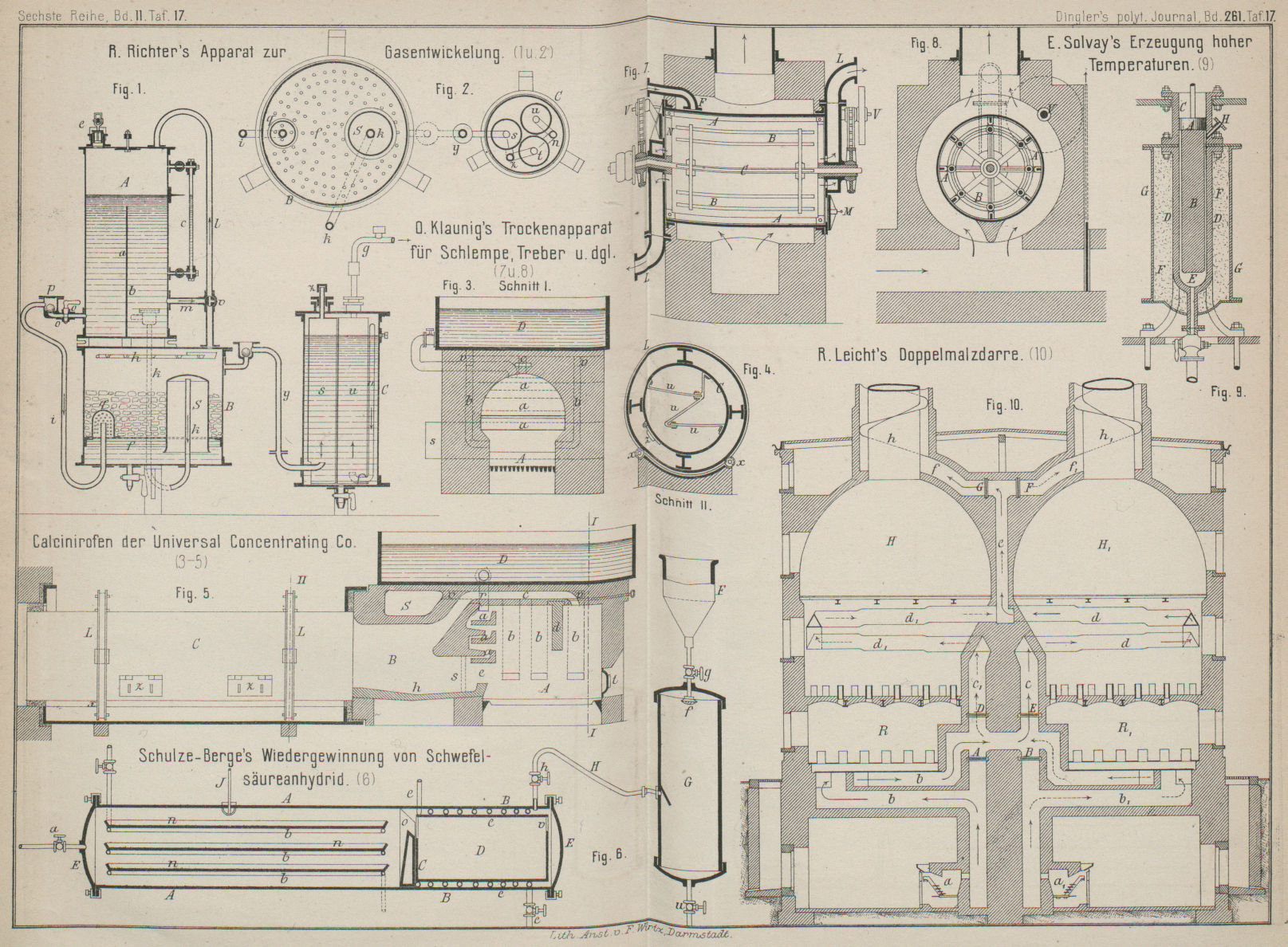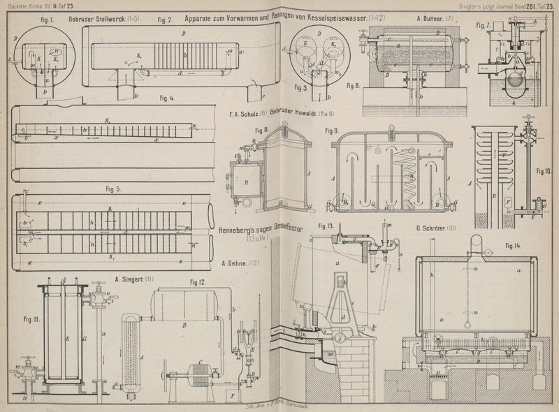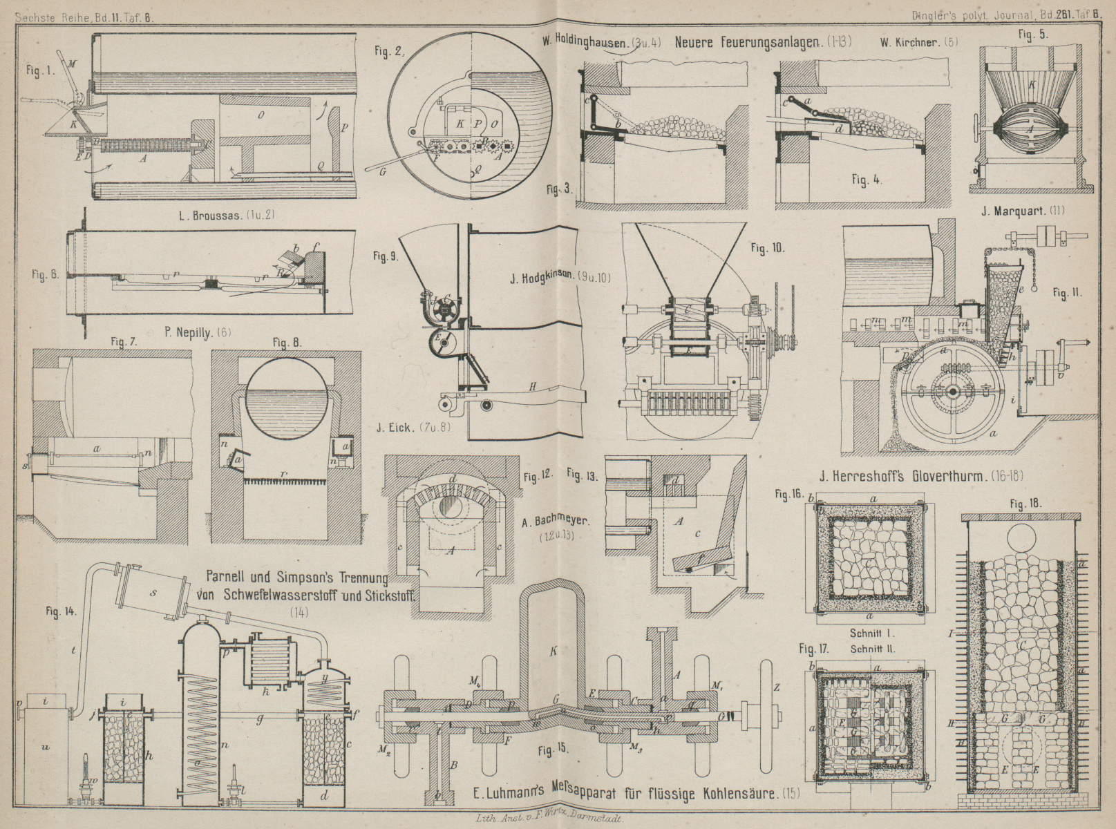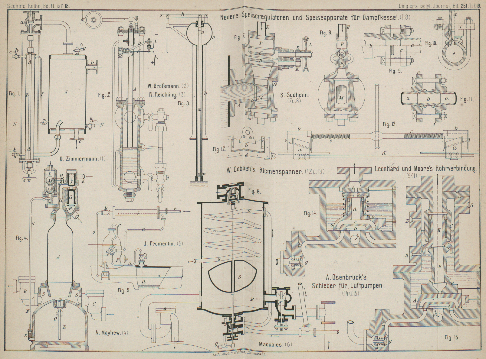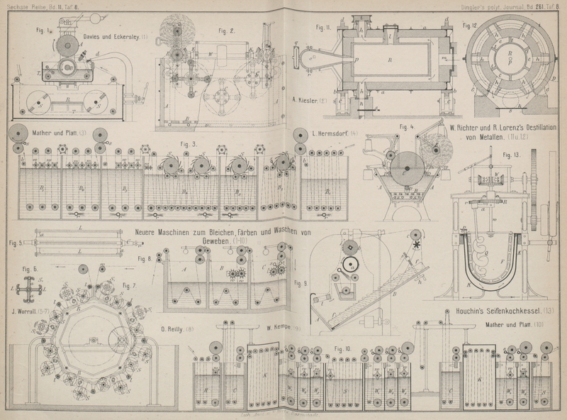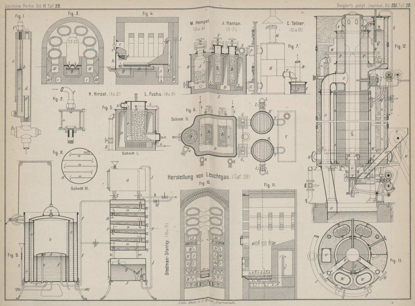Berichtigung. In der Tabelle betreff. Auſstieg des Erdöles S. 83 Spalte 2 ist zu setzen „t“ statt „a“. – S. 88 (W. Thomson's Prüfung von Stärkekleister) Z. 13 v. u. ist zu lesen „(250mm lang und 6mm dick)“ statt „(25mm + 4mm)“. Dingler's polytechnisches Journal. Herausgegeben von Prof. Joh. Zeman und Dr. Ferd. Fischer in Stuttgart in Hannover. 67. Jahrgang: 28. Juli 1886. Band 261. Heft 4. Mit 3 Tafeln Abbildungen (Tafel 9–11) und Textabbildungen. Stuttgart. Verlag der J. G. COTTA'schen Buchhandlung.1886 Cupolofen mit getrennter Verbrennung des Kohlenoxydgases. D. R. P. 33212. Alleinigen Vertrieb für Deutschland hat FRITZ W. LUERMANN, Techn. Bureau OSNABRUECK. Bezirksvertreter gesucht. Textabbildung Bd. 261 Textabbildung Bd. 261 Anzeigen der Redaction (28. Juli 1886.)vonDingler's polytechnischem Journal. Inhalt von Nr. 4 Band 261. * bedeutet mit Abbild. Neuerungen an Condensatoren für Dampfmaschinen. Oberflächencondensatoren: F. Wheeler's Condensator mit einseitig befestigten Röhren und eingesteckten Umlaufsröhren *. W. Beaumont's Condensator mit schraubenartig in einander gewundenen Wellröhren für Torpedomaschinen *. F. und H. Hocking's Condensator mit zwischen Doppelröhren gebildeten schraubenförmigen Kanälen, besonders zur Gewinnung von Süſswasser auf Schiffen *. Einspritzcondensatoren: O. Wirth's Condensator mit radial über einander angeordneten Stäben zur Zertheilung des Wasserstrahles *. J. Alberger und Th. Sault's Verbindung von sog. Injector- und Ejectorcondensatoren mit Pumpen zur Absaugung des Luft- und Wassergemisches * 145 J. Klein's Kleindampfmaschine bez. Speisepumpe für das Condensationswasser; von Klein, Schanzlin und Becker in Frankenthal * 150 Neue Zündvorrichtungen für Gaskraftmaschinen: Zündungen mit Uebertragungsflamme für Maschinen, welche mit verdichtetem Gemenge arbeiten; von M. Schütz * bez. der Gasmotorenfabrik Deutz *. Zündung durch Berührung mit erhitzten Körpern für Maschinen, welche mit verlängertem Cylinderraume arbeiten; von der Berliner Maschinenbau Actiengesellschaft vormals L. Schwartzkopff * 151 Neuere Bremsen für Hebezeuge: Sperrkegelbremse auf einer besonderen Welle des Windewerkes; von der Maschinenfabrik Cyclop, Mehlis und Behrens in Berlin *. J. Weidtman's Sicherheitskurbel. Beck und Henkel's Geschwindigkeitsbremse für Hebezeuge * 154 Gewellte Dampfkessel-Flammrohre und deren Herstellung: S. Fox's Flammrohre mit ungewellter Schweiſsstelle bez. Presse und Walzwerk zu deren Herstellung. Ueber Festigkeit von Wellrohren gegen äuſseren Druck. H. Mc Kaig und J. C. Stitt's Wellrohre für die Feuerkammern von Schiffskesseln 156 Brown und Sharpe's Universal-Schleif- und Schärfmaschine * 157 G. Eiffel's bez. A. Cottrau's zerlegbare, aus Dreiecken bez. Vierecken zusammengesetzte eiserne Brücken * 162 C. Roberts' Auffangapparat für Regenwasser zur Scheidung des von Dächern ablaufenden Schmutzwassers * 166 A. Munzinger's schräg liegender Schachttrockenapparat für Getreide, Holzstoff u. dgl. * 169 Neuerungen an Trockenöfen für Herstellung von Preſskohlen: Jalousiethüren für Dampftelleröfen zum Trocknen von Braunkohle bez. Aufstellung von Dampftelleröfen; von der Zeitzer Eisengieſserei und Maschinenbau-Actiengesellschaft *. Nachgiebige Verbindungen der Rührschaufeln mit den Rührarmen; von C. Rowold * bez. der Zeitzer Eisengieſserei *. J. Wendlandt's bewegliche Verbindung der Rührarme *. Trockenofen mit besonderem Mischteller für mit Pech zu bindende Steinkohlen; von der Maschinenfabrik Hohenzollern * 170 Fr. Siemens' Sandstrahlapparat zur Herstellung und Ausbesserung des Ofenfutters bei Schmelzöfen * 173 Ueber Neuerungen im Hüttenwesen (Fortsetzung): Bourbouze's weiſse Aluminiumlegirung. Ueber Herstellung von Aluminiumlegirungen nach dem Verfahren von Cowles; von Mehner, Martius bez. W. Siemens. Ueber unmittelbare Herstellung von Eisen und Stahl aus mit Melasse geformten pulverigen Eisenerzen, bez. Beseitigung des Zinkes bei der Verwerthung der Schwefelkiesabbrände; von Kosmann. Kosmann's Untersuchung von Rohzink aus Zinkabfällen. R. Conley's Reduction pulveriger Eisenerze. W. Walton's Verhinderung des Steigens beim Umschmelzen des Garkupfers 174 Ueber Wasserreinigung durch Filtration; von A. Salamon und V. de Vere Mathew 178 E. Hermite's Verfahren zum Bleichen von Faserstoffen durch elektrolytische Zerlegung von Chlormagnesium * 180 Kleinere Mittheilungen: H. Ochwadt's getheilte Rollen für Kettenförderung * 181Ausdehnsamer federnder Gelenkbolzen; von der Société Gautier, Pozzy et Co. in Paris 182Manometer-Probirvorrichtung der Oesterreichisch-Ungarischen Staatsbahn-Gesellschaft 182H. Crone's Verfahren zum Schälen von Kartoffeln mittels Sandstrahl 182M. Leblanc's neue Art der mehrfachen Telephonie 183Zur Geschichte der Herstellung von festem Aetznatron; von P. Hart 183J. Toth's Bestimmung des Phenoles in roher Carbolsäure 183Ueber Cer haltige Ziegelsteine; von J. Strohecker bez. C. Blomstrand 184Ueber die Löslichkeit von Silberchromat in Ammoniumnitrat; von R. Carpenter bez. G. Biscaro 184Ueber die Einwirkung von Anilin auf Orcin; von A. Zega 184C. Andersen's Seife zum Reinigen befleckter Kleidungsstücke und zum Auffrischen verschossener Farben 184 Es wird höflichst ersucht, alle die Redaction betreffenden Mittheilungen, Sendungen u. dgl. gefälligst zu adressiren: An die Redaction von Dingrler's polytechn. Journal Hrn. Prof. Joh. Zeman in Stuttgart, bezieh. Hrn. Dr. Ferd. Fischer in Hannover, Alleestraſse 9; alle die Expedition und Anzeigen betreffenden Schreiben an die J. G. Cotta'sche Buchhandlung in Stuttgart. ☞ Prof. Zeman in Stuttgart wohnt Hoppenlaustrafge 2 ☜ (Ecke der Schloſsstraſse). Mit der Ausführung der lithographischen Beilagen zu „Dingler's polytechnisches Journal“ betraut, erlaube ich mir meine lithographische Anstalt und Druckerei zur Anfertigung von „Technischen Zeichnungen für Maschinenbau und Architectur etc., Musterbüchern für Fabriken und