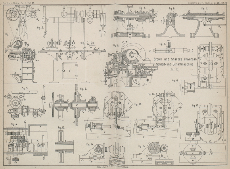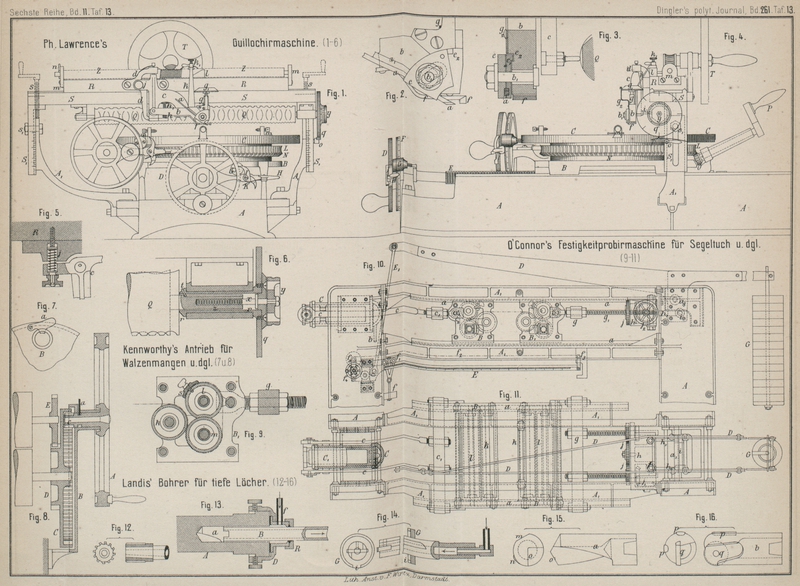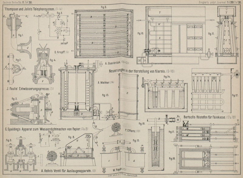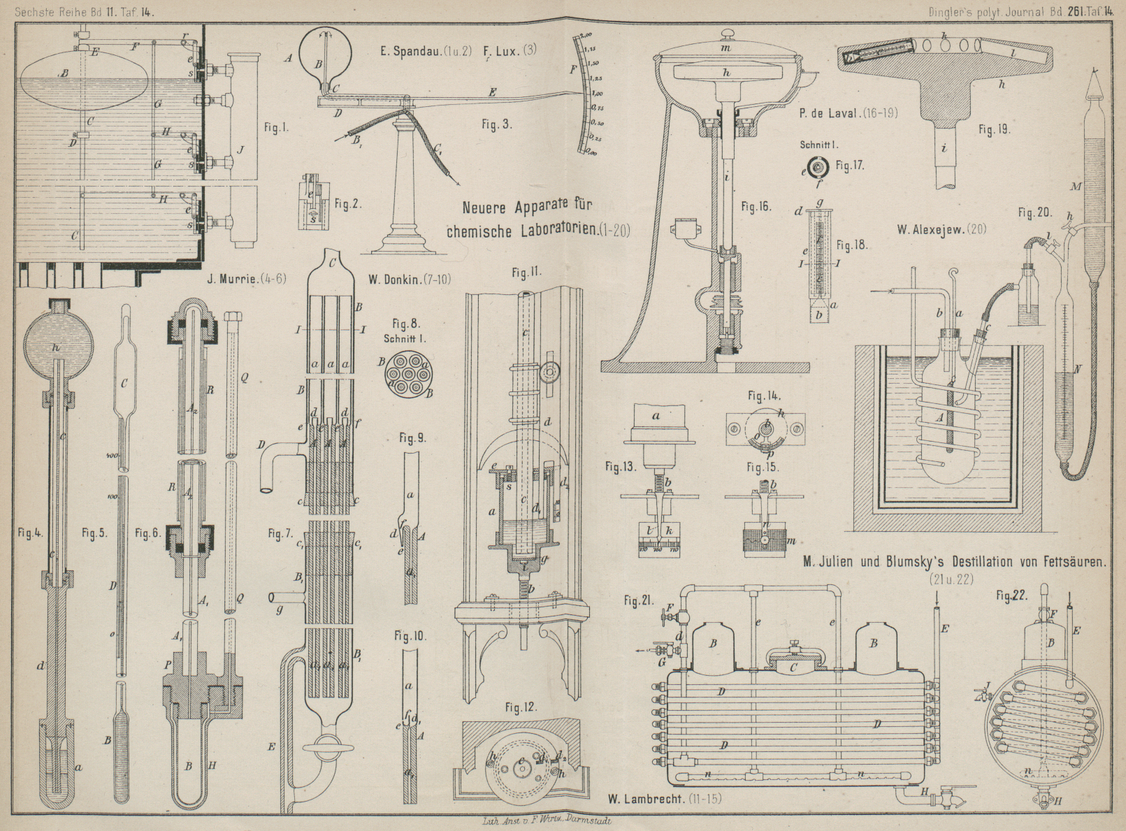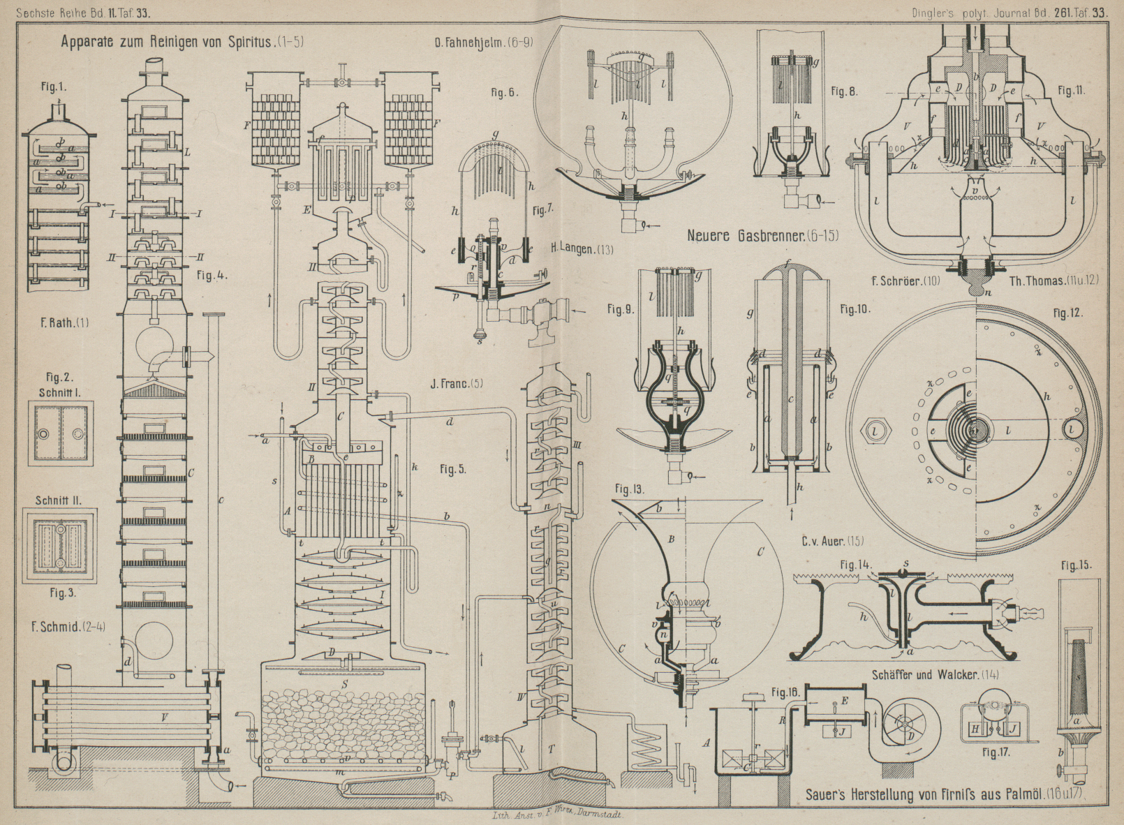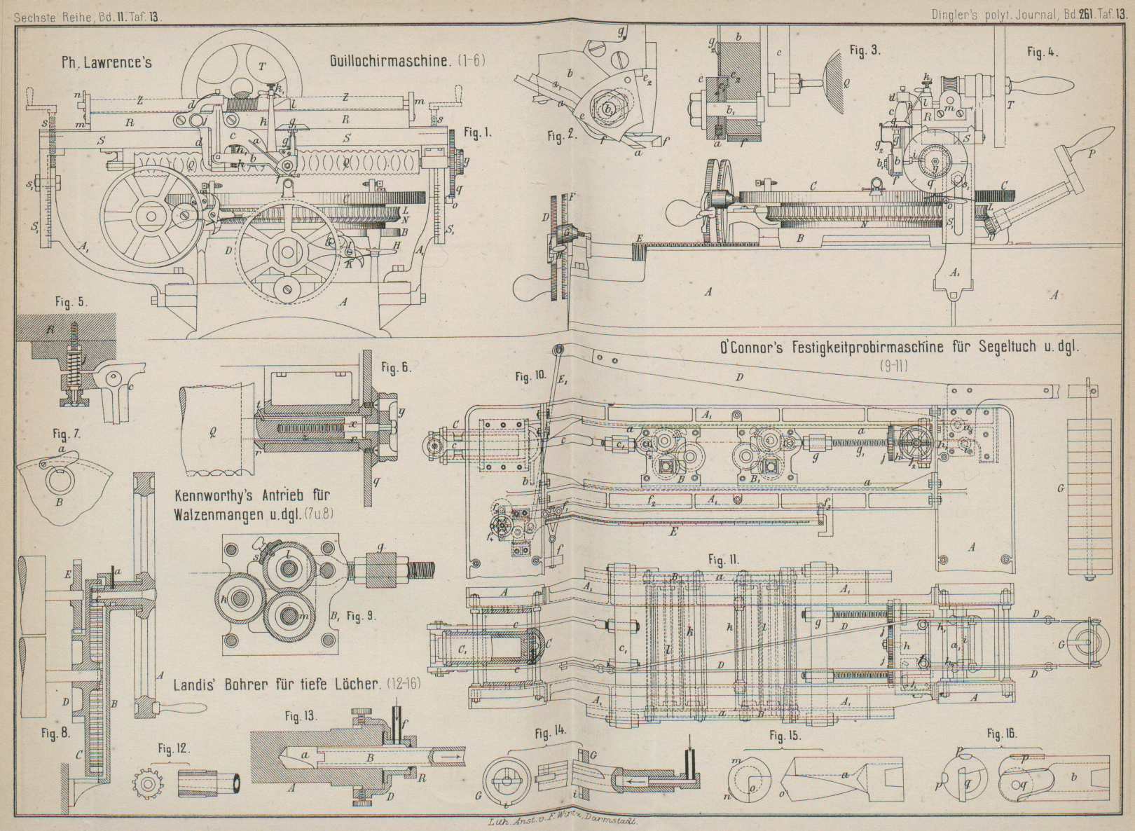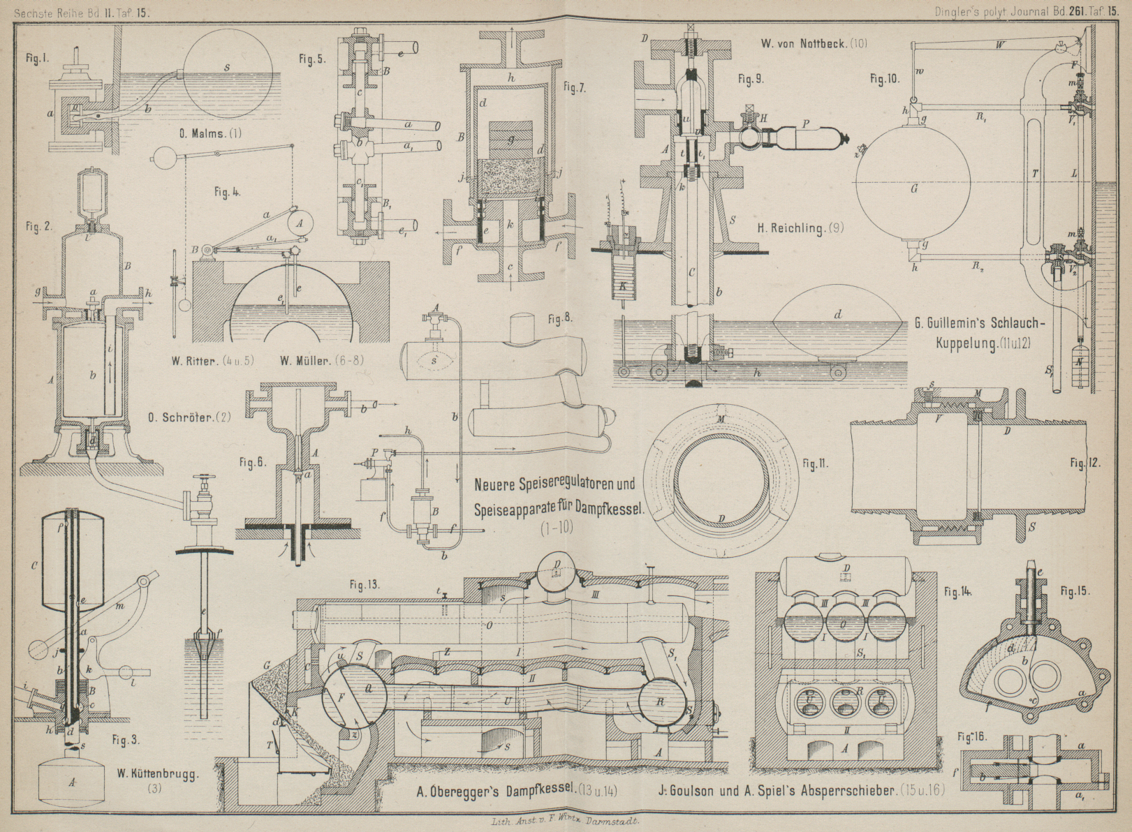Berichtigung. In der Tabelle betreff. Auſstieg des Erdöles S. 83 Spalte 2 ist zu setzen „t“ statt „a“. – S. 88 (W. Thomson's Prüfung von Stärkekleister) Z. 13 v. u. ist zu lesen „(250mm lang und 6mm dick)“ statt „(25mm + 4mm)“. Dingler's polytechnisches Journal. Herausgegeben von Prof. Joh. Zeman und Dr. Ferd. Fischer in Stuttgart in Hannover. 67. Jahrgang: 28. Juli 1886. Band 261. Heft 4. Mit 3 Tafeln Abbildungen (Tafel 9–11) und Textabbildungen. Stuttgart. Verlag der J. G. COTTA'schen Buchhandlung.1886 Cupolofen mit getrennter Verbrennung des Kohlenoxydgases. D. R. P. 33212. Alleinigen Vertrieb für Deutschland hat FRITZ W. LUERMANN, Techn. Bureau OSNABRUECK. Bezirksvertreter gesucht. Textabbildung Bd. 261 Textabbildung Bd. 261 Anzeigen der Redaction (28. Juli 1886.)vonDingler's polytechnischem Journal. Inhalt von Nr. 4 Band 261. * bedeutet mit Abbild. Neuerungen an Condensatoren für Dampfmaschinen. Oberflächencondensatoren: F. Wheeler's Condensator mit einseitig befestigten Röhren und eingesteckten Umlaufsröhren *. W. Beaumont's Condensator mit schraubenartig in einander gewundenen Wellröhren für Torpedomaschinen *. F. und H. Hocking's Condensator mit zwischen Doppelröhren gebildeten schraubenförmigen Kanälen, besonders zur Gewinnung von Süſswasser auf Schiffen *. Einspritzcondensatoren: O. Wirth's Condensator mit radial über einander angeordneten Stäben zur Zertheilung des Wasserstrahles *. J. Alberger und Th. Sault's Verbindung von sog. Injector- und Ejectorcondensatoren mit Pumpen zur Absaugung des Luft- und Wassergemisches * 145 J. Klein's Kleindampfmaschine bez. Speisepumpe für das Condensationswasser; von Klein, Schanzlin und Becker in Frankenthal * 150 Neue Zündvorrichtungen für Gaskraftmaschinen: Zündungen mit Uebertragungsflamme für Maschinen, welche mit verdichtetem Gemenge arbeiten; von M. Schütz * bez. der Gasmotorenfabrik Deutz *. Zündung durch Berührung mit erhitzten Körpern für Maschinen, welche mit verlängertem Cylinderraume arbeiten; von der Berliner Maschinenbau Actiengesellschaft vormals L. Schwartzkopff * 151 Neuere Bremsen für Hebezeuge: Sperrkegelbremse auf einer besonderen Welle des Windewerkes; von der Maschinenfabrik Cyclop, Mehlis und Behrens in Berlin *. J. Weidtman's Sicherheitskurbel. Beck und Henkel's Geschwindigkeitsbremse für Hebezeuge * 154 Gewellte Dampfkessel-Flammrohre und deren Herstellung: S. Fox's Flammrohre mit ungewellter Schweiſsstelle bez. Presse und Walzwerk zu deren Herstellung. Ueber Festigkeit von Wellrohren gegen äuſseren Druck. H. Mc Kaig und J. C. Stitt's Wellrohre für die Feuerkammern von Schiffskesseln 156 Brown und Sharpe's Universal-Schleif- und Schärfmaschine * 157 G. Eiffel's bez. A. Cottrau's zerlegbare, aus Dreiecken bez. Vierecken zusammengesetzte eiserne Brücken * 162 C. Roberts' Auffangapparat für Regenwasser zur Scheidung des von Dächern ablaufenden Schmutzwassers * 166 A. Munzinger's schräg liegender Schachttrockenapparat für Getreide, Holzstoff u. dgl. * 169 Neuerungen an Trockenöfen für Herstellung von Preſskohlen: Jalousiethüren für Dampftelleröfen zum Trocknen von Braunkohle bez. Aufstellung von Dampftelleröfen; von der Zeitzer Eisengieſserei und Maschinenbau-Actiengesellschaft *. Nachgiebige Verbindungen der Rührschaufeln mit den Rührarmen; von C. Rowold * bez. der Zeitzer Eisengieſserei *. J. Wendlandt's bewegliche Verbindung der Rührarme *. Trockenofen mit besonderem Mischteller für mit Pech zu bindende Steinkohlen; von der Maschinenfabrik Hohenzollern * 170 Fr. Siemens' Sandstrahlapparat zur Herstellung und Ausbesserung des Ofenfutters bei Schmelzöfen * 173 Ueber Neuerungen im Hüttenwesen (Fortsetzung): Bourbouze's weiſse Aluminiumlegirung. Ueber Herstellung von Aluminiumlegirungen nach dem Verfahren von Cowles; von Mehner, Martius bez. W. Siemens. Ueber unmittelbare Herstellung von Eisen und Stahl aus mit Melasse geformten pulverigen Eisenerzen, bez. Beseitigung des Zinkes bei der Verwerthung der Schwefelkiesabbrände; von Kosmann. Kosmann's Untersuchung von Rohzink aus Zinkabfällen. R. Conley's Reduction pulveriger Eisenerze. W. Walton's Verhinderung des Steigens beim Umschmelzen des Garkupfers 174 Ueber Wasserreinigung durch Filtration; von A. Salamon und V. de Vere Mathew 178 E. Hermite's Verfahren zum Bleichen von Faserstoffen durch elektrolytische Zerlegung von Chlormagnesium * 180 Kleinere Mittheilungen: H. Ochwadt's getheilte Rollen für Kettenförderung * 181Ausdehnsamer federnder Gelenkbolzen; von der Société Gautier, Pozzy et Co. in Paris 182Manometer-Probirvorrichtung der Oesterreichisch-Ungarischen Staatsbahn-Gesellschaft 182H. Crone's Verfahren zum Schälen von Kartoffeln mittels Sandstrahl 182M. Leblanc's neue Art der mehrfachen Telephonie 183Zur Geschichte der Herstellung von festem Aetznatron; von P. Hart 183J. Toth's Bestimmung des Phenoles in roher Carbolsäure 183Ueber Cer haltige Ziegelsteine; von J. Strohecker bez. C. Blomstrand 184Ueber die Löslichkeit von Silberchromat in Ammoniumnitrat; von R. Carpenter bez. G. Biscaro 184Ueber die Einwirkung von Anilin auf Orcin; von A. Zega 184C. Andersen's Seife zum Reinigen befleckter Kleidungsstücke und zum Auffrischen verschossener Farben 184 Es wird höflichst ersucht, alle die Redaction betreffenden Mittheilungen, Sendungen u. dgl. gefälligst zu adressiren: An die Redaction von Dingrler's polytechn. Journal Hrn. Prof. Joh. Zeman in Stuttgart, bezieh. Hrn. Dr. Ferd. Fischer in Hannover, Alleestraſse 9; alle die Expedition und Anzeigen betreffenden Schreiben an die J. G. Cotta'sche Buchhandlung in Stuttgart. ☞ Prof. Zeman in Stuttgart wohnt Hoppenlaustrafge 2 ☜ (Ecke der Schloſsstraſse). Mit der Ausführung der lithographischen Beilagen zu „Dingler's polytechnisches Journal“ betraut, erlaube ich mir meine lithographische Anstalt und Druckerei zur Anfertigung von „Technischen Zeichnungen für Maschinenbau und Architectur etc., Musterbüchern für Fabriken und